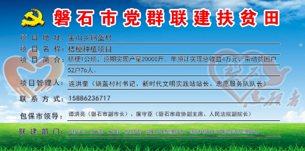 锅盔村,全村行政区域25.07平方公里,下辖7个自然屯,现有635户,人口总数2660人,贫困户52户、76人,全村共有4个志愿服务队,志愿者400人,耕地面积8690亩,党群联建扶贫田1块、共10亩,主要经济作物有玉米、水稻,村书记:连洪奎,联系电话:15886236717。