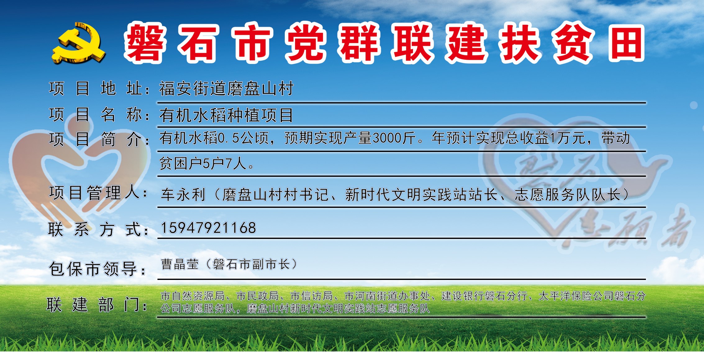 磨盘山村(省级贫困村),全村行政区域11.95平方公里,下辖4个自然屯,现有330户,人口总数1230人,贫困户49户、54人,全村共有3支志愿服务队,志愿者45人,耕地面积326公顷,党群联建扶贫田1块、共0.5公顷,主要经济作物为有机水稻,村书记:车永利,联系电话15947921168。