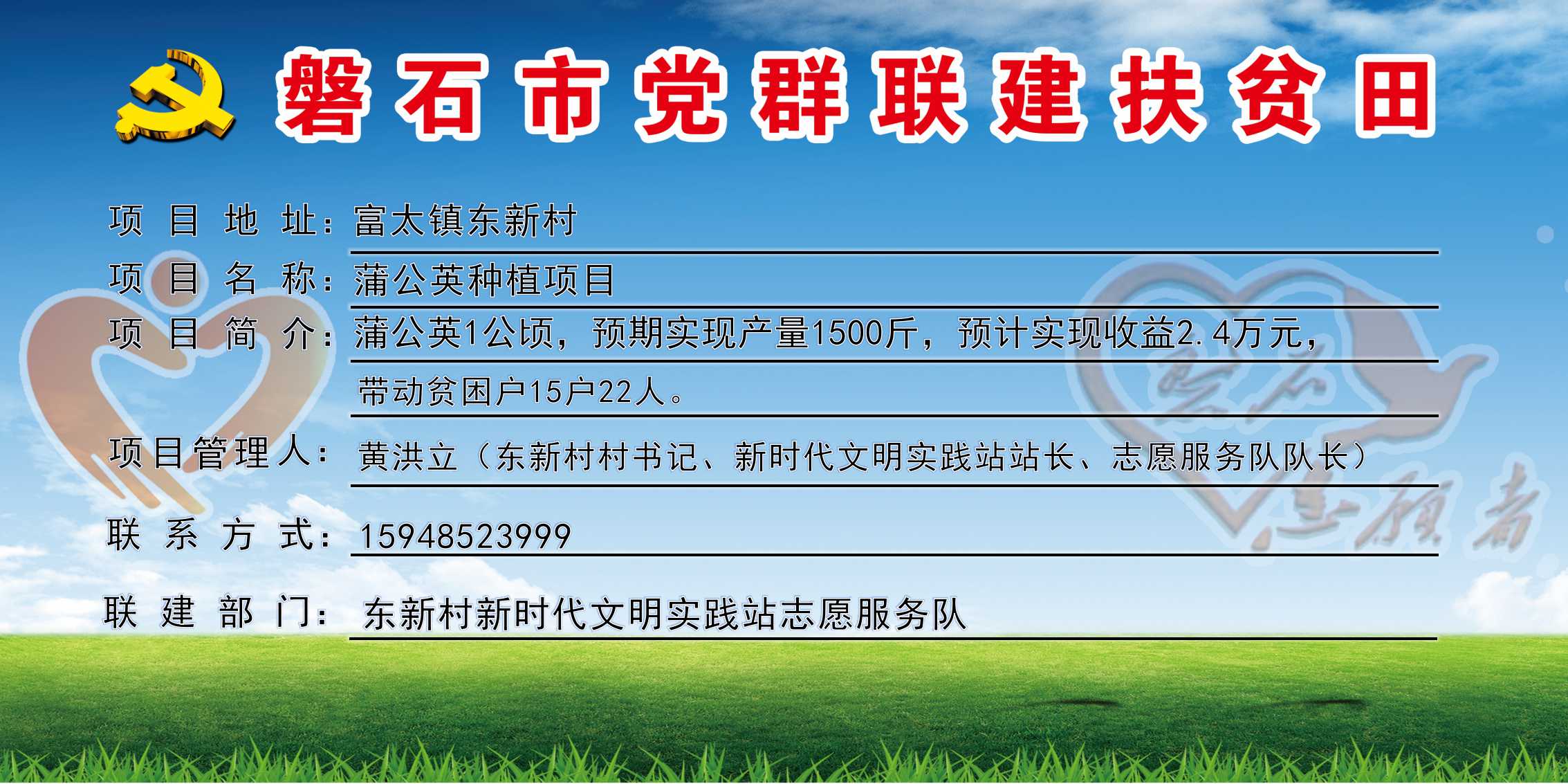 东新村,全村行政区域20平方公里,下辖3个自然屯,现有200户,人口总数890人,贫困户15户、22人,全村共有5志愿服务队,志愿者158人,耕地面积393.7公顷,党群联建扶贫田1块、共15亩,主要经济作物有玉米,村书记姓名黄洪立,联系电话:15948523999。