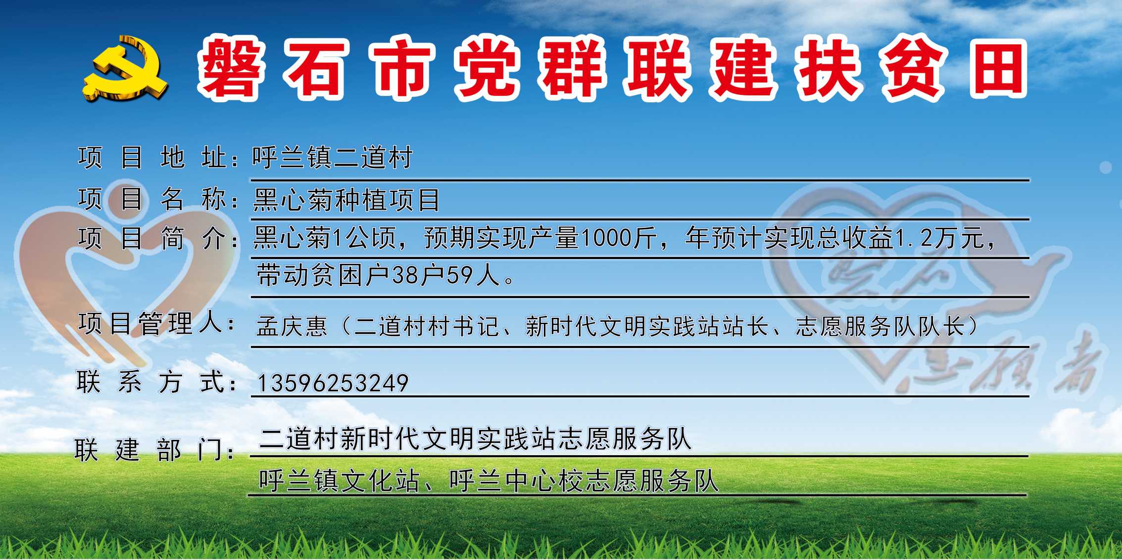 支志愿服务队,志愿者170人,耕地面积297公顷,党群联建扶贫田1块、共1公顷,主要经济作物黑心菊,村书记:孟庆惠,联系电话:13596253249。