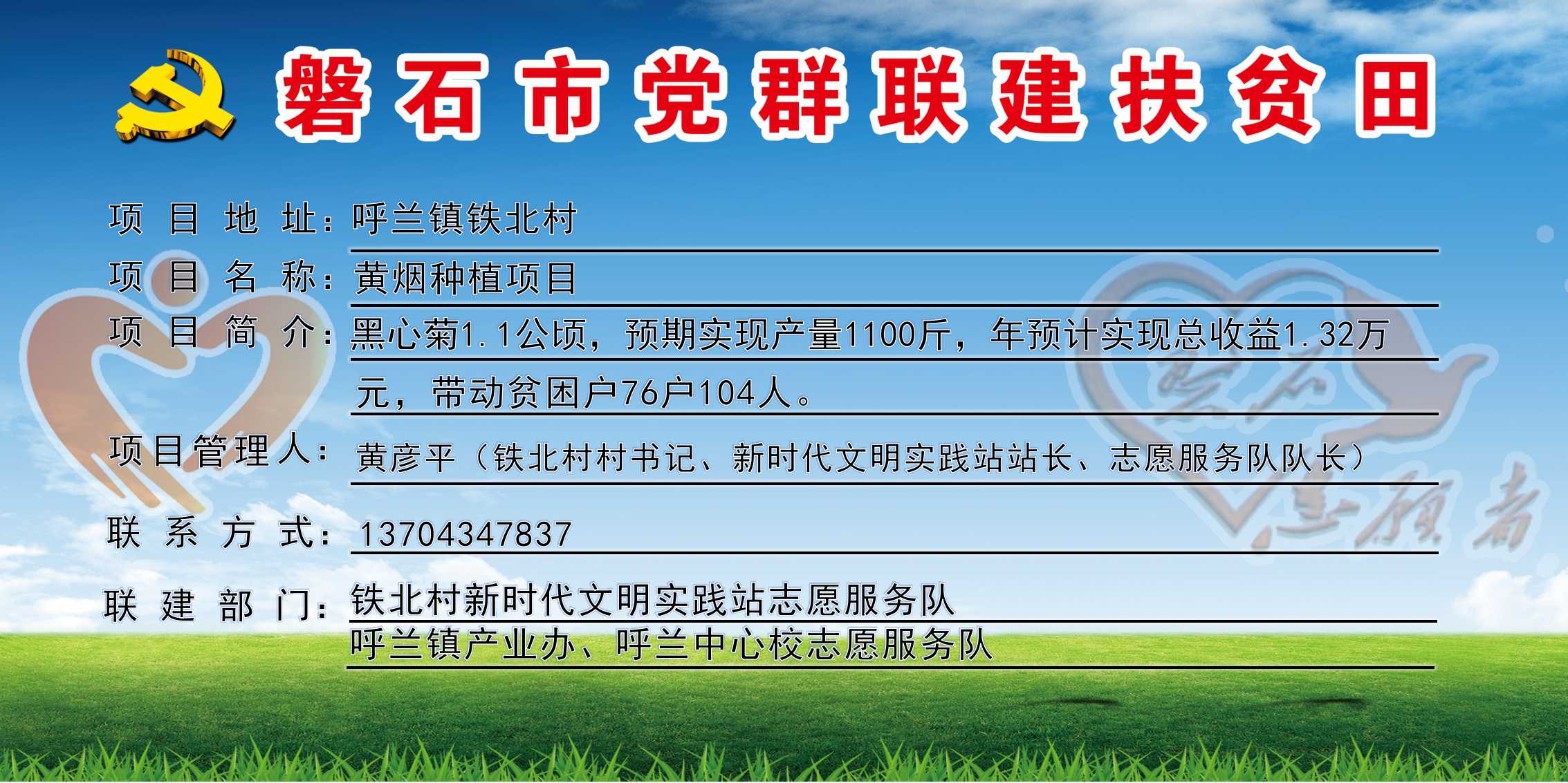支志愿服务队,志愿者80人,耕地面积330公顷,党群联建扶贫田1块、共1公顷,主要经济作物黄烟,村书记:黄彦平,联系电话:13704347837。