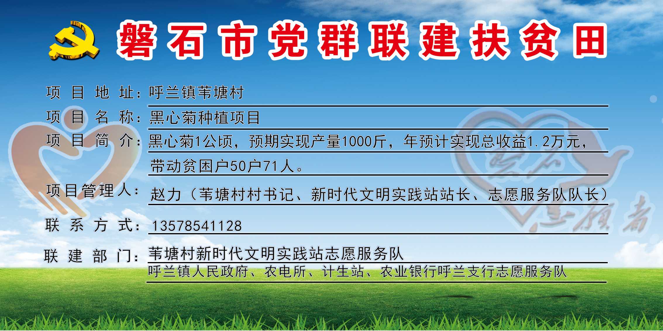 苇塘村,全村行政区域22.5平方公里,下辖5个自然屯,现有720户,人口总数2343人,贫困户50户、71人,全村共有1支志愿服务队,志愿者350人,耕地面积1125公顷,党群联建扶贫田1块、共1公顷,主要经济作物黑心菊,村书记:赵力,联系电话:13578541128。