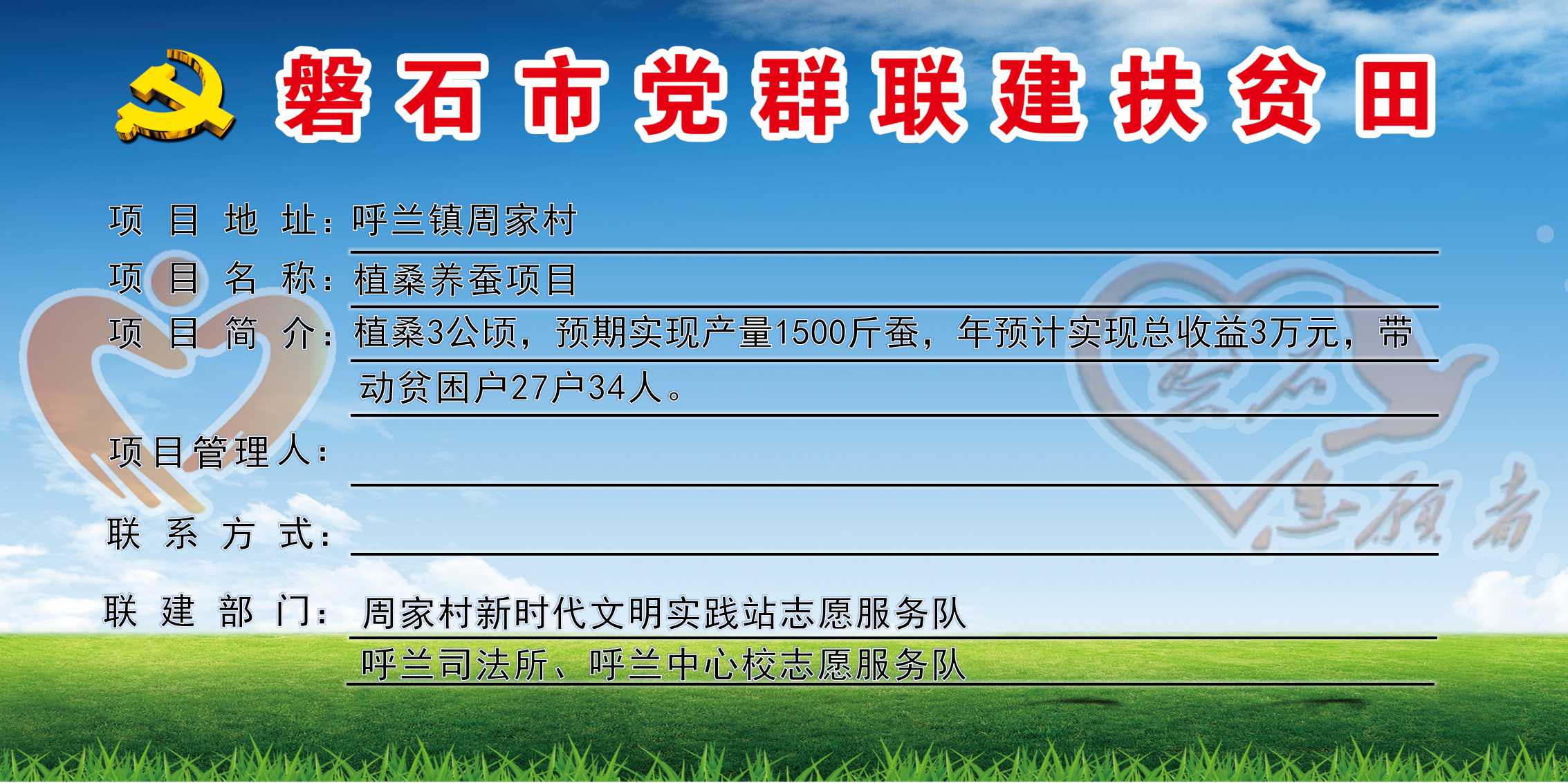周家村,全村行政区域6.5平方公里,下辖3个自然屯,现有165户,人口总数702人,贫困户27户、34人,全村共有1支志愿服务队,志愿者100人,耕地面积125公顷,党群联建扶贫田1块、共3公顷,主要经济作物有植桑养蚕。