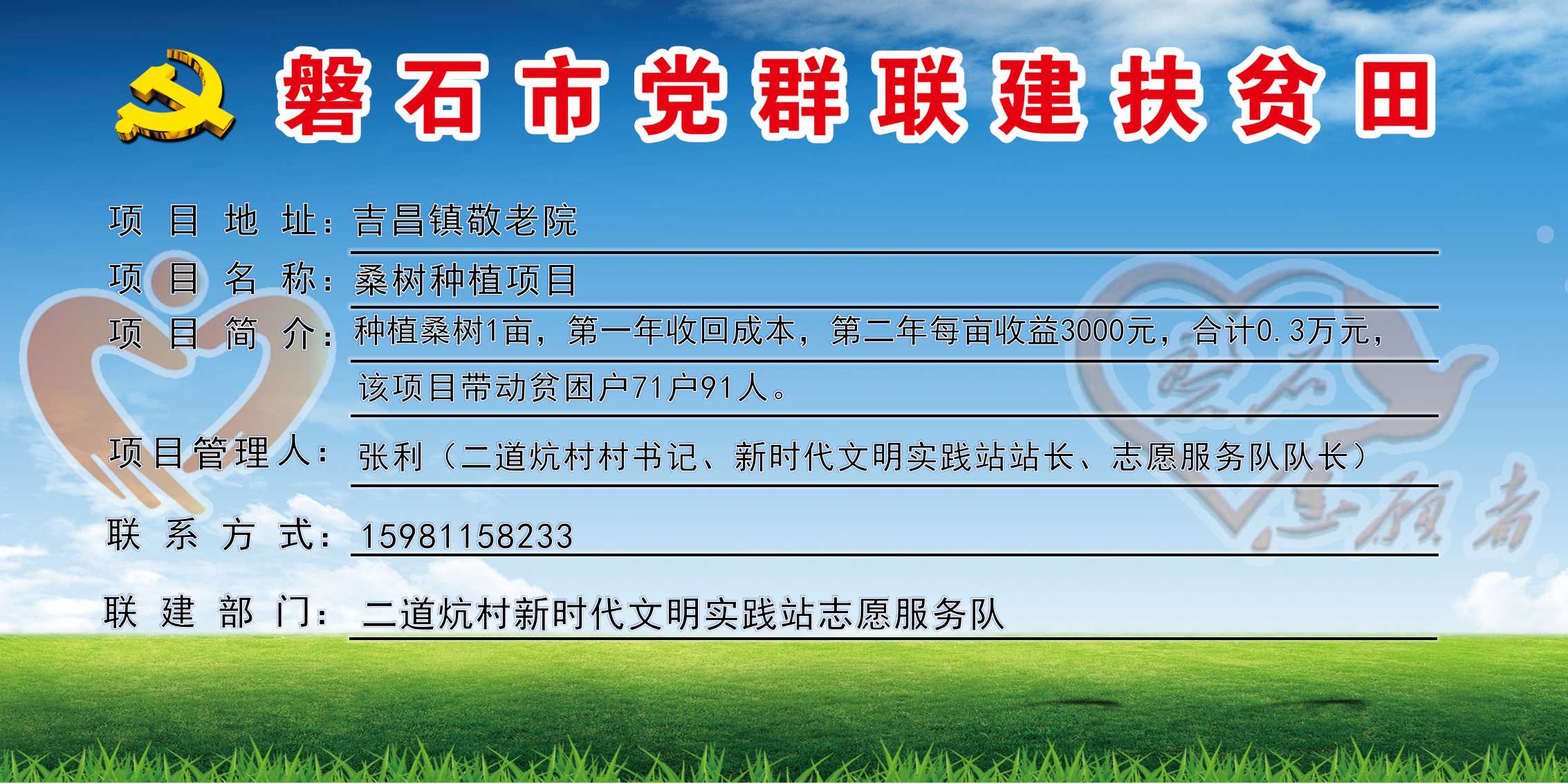 二道炕村,全村行政区域58平方公里,下辖6个自然屯,现467户,人口总数1883人,贫困户71户91人,全村共有个1志愿服务队,志愿者20人,耕地面积1013亩,在吉昌镇敬老院建设党群联建扶贫田1块、共1.5亩,主要经济作物为桑树,村书记 :张利 ,联系电话:15981158233。