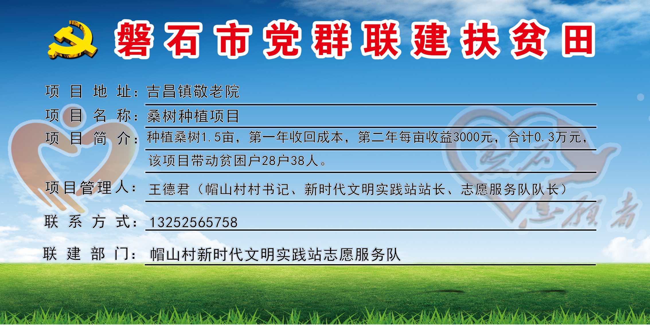 帽山村,全村行政区域15平方公里,下辖5个自然屯,现有310户,人口总数1100人,贫困户28户38人,全村共有个2志愿服务队,志愿者20人,耕地面积4600亩,在吉昌镇敬老院建设党群联建扶贫田1块、共1.5亩,主要经济作物为桑树,村书记:王德君,联系电话:13252565758。