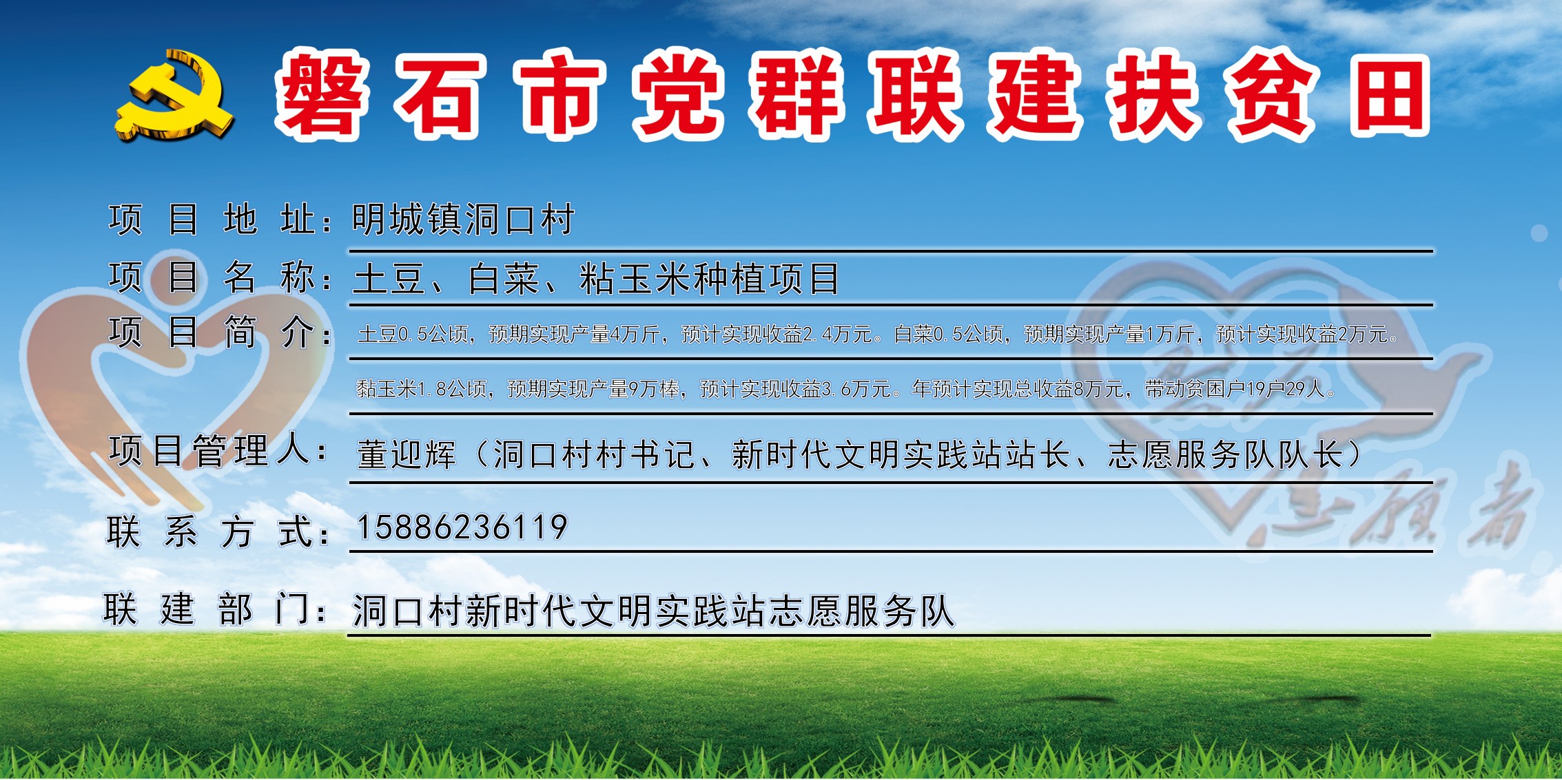 洞口村,全村行政区域10.02平方公里,下辖5个自然屯,现有379户,人口总数1509人,贫困户19户、29人,全村共有1支志愿服务队,志愿者450人,耕地面积456公顷,党群联建扶贫田2块、共2.3公顷,主要经济作物玉米、水稻,村书记:董迎辉,联系电话:15886236119。