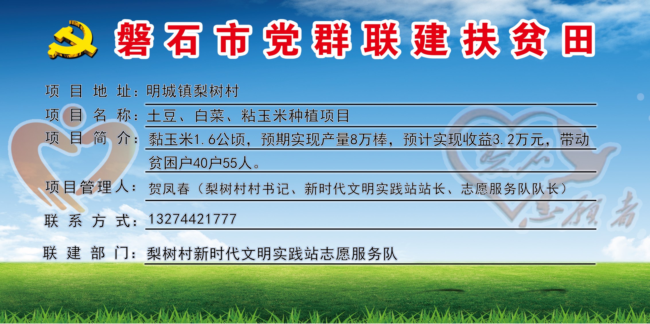 梨树村,全村行政区域14平方公里,下辖4个自然屯,现有380户,人口总数1775人,贫困户40户、55人,全村共有1支志愿服务队,志愿者440人,耕地面积500公顷,党群联建扶贫田1块、共1.6公顷,主要经济作物有玉米、水稻,村书记:贺凤春,联系电话:13274421777。