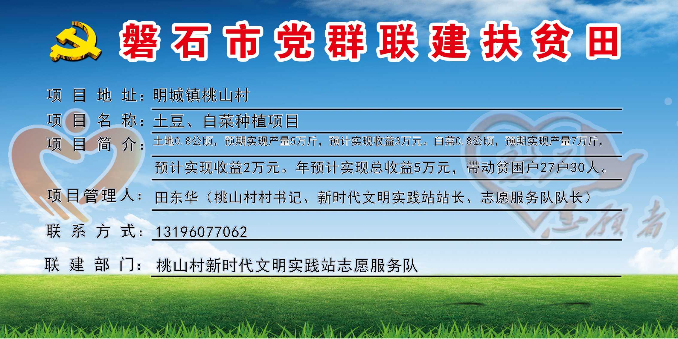 桃山村,全村行政区域18平方公里,下辖2个自然屯,现有237户,人口总数1023人,贫困户27户、30人,全村共有1支志愿服务队,志愿者300人,耕地面积267公顷,党群联建扶贫田2块、共0.8公顷,主要经济作物有玉米、水稻,村书记:田东华,联系电话:13196077062。