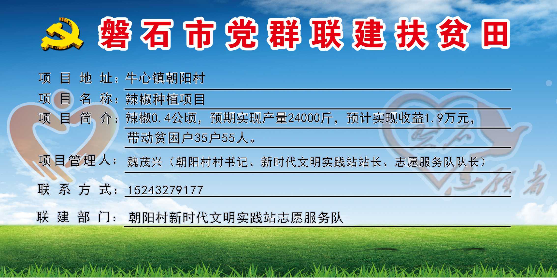 朝阳村,全村行政区域14.63平方公里,下辖4个自然屯,现有430户,人口总数1835人,贫困户35户、55人,全村共有1支志愿服务队,志愿者27人,耕地面积4390亩,党群联建扶贫田1块、共6亩,主要经济作物有玉米、水稻,村书记:魏茂兴,联系电话:15243279177。
