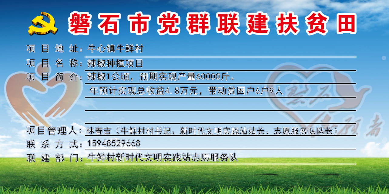 牛鲜村,全村行政区域0.85平方公里,下辖1个自然屯,现有72户,人口总数275人,贫困户6户、9人,全村共有1支志愿服务队,志愿者12人,耕地面积1117亩,党群联建扶贫田1块、共10亩,主要经济作物有水稻、辣椒,村书记姓名:林春吉,联系电话:15948529668。