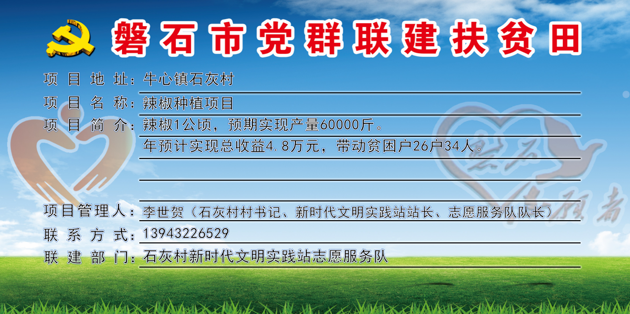 石灰村,全村行政区域11平方公里,下辖4个自然屯,现有337户,人口总数1208人,贫困户26户、34人,全村共有1支志愿服务队,志愿者28人,耕地面积2580亩,党群联建扶贫田1块、共10亩,主要经济作物有玉米、水稻,村书记姓名:李世贺,联系电话:13943226529。
