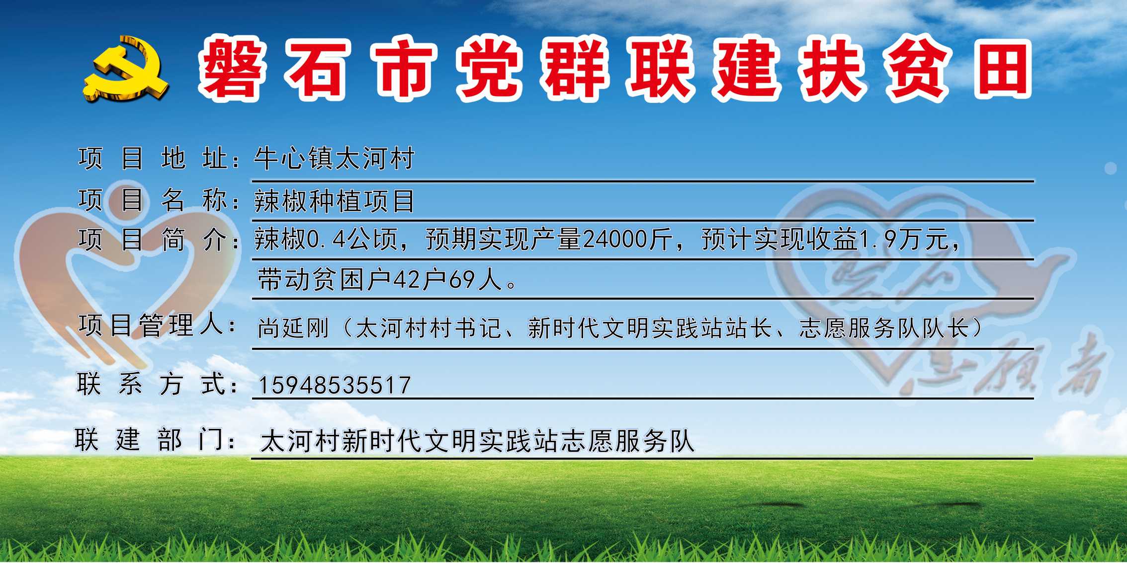 太河村,全村行政区域26平方公里,下辖4个自然屯,现有360户,人口总数1594人,贫困户42户、69人,全村共有1支志愿服务队,志愿者31人,耕地面积4600亩,党群联建扶贫田1块、共6亩,主要经济作物有玉米、水稻,村书记:尚延刚,联系电话:15948535517。