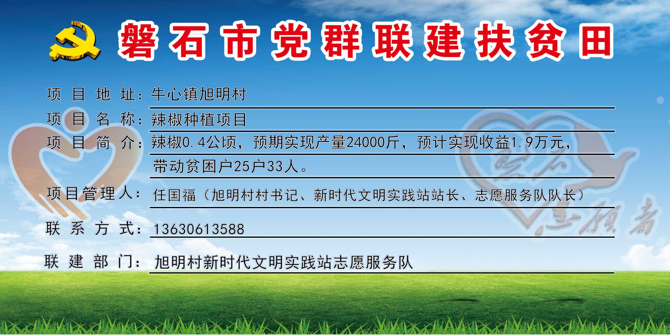 旭明村,全村行政区域59平方公里,下辖7个自然屯,现有418户,人口总数1812人,贫困户25户、33人,全村共有1志愿服务队,志愿者32人,耕地面积8800亩,党群联建扶贫田1块、共6亩,主要经济作物有玉米、水稻,村书记:任国福,联系电话:13630613588。
