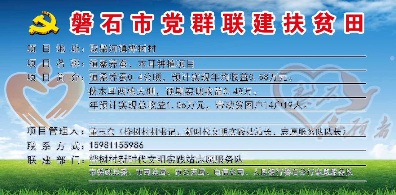 桦树村,全村行政区域17.2平方公里,下辖5个自然屯,现有200户,人口总数640人,贫困户14户、19人,全村共有1支志愿服务队,志愿者9人,耕地面积2160亩,党群联建扶贫田2块、共10亩地,两栋大棚,主要经济作物有植桑养蚕、食用菌,村书记姓名:董玉东,联系电话:15981155986。