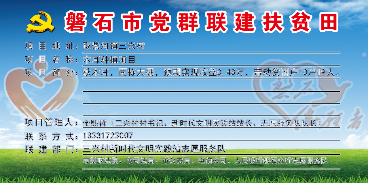 三兴村,全村行政区域2平方公里,下辖1个自然屯,现有210户,人口总数909人,贫困户10户、19人,全村共有1支志愿服务队,志愿者4人,耕地面积1830亩,党群联建扶贫田1块,两栋大棚,主要经济作物有食用菌,村书记姓名:金熙哲,联系电话:13331723007。