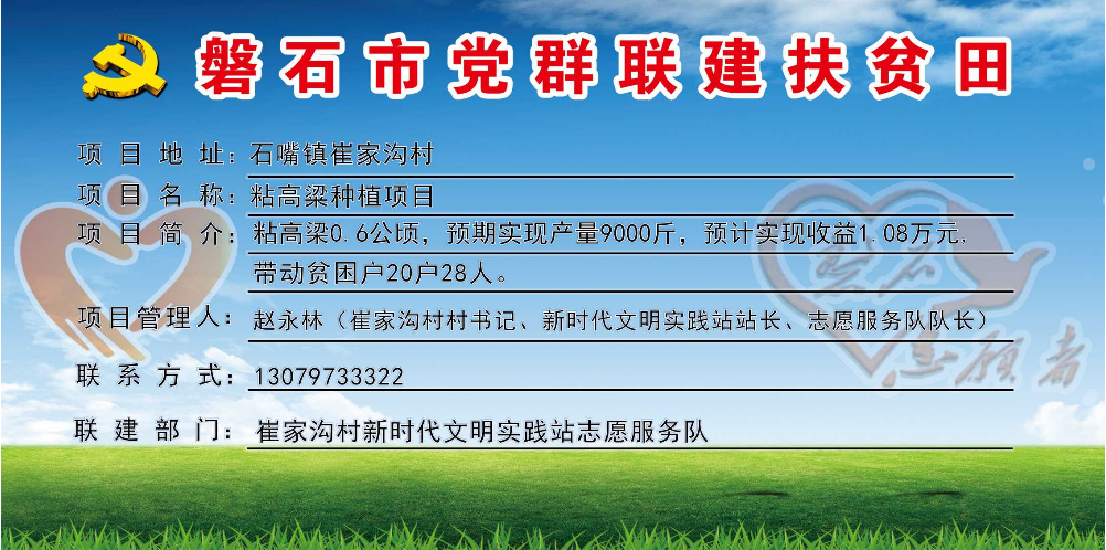 崔家沟村,全村行政区域7.13平方公里,下辖3个自然屯,现有163户,人口总数629人,贫困户20户、28人,全村共有3志愿服务队,志愿者76人,耕地面积2598亩,党群联建扶贫田1块、共9亩,主要经济作物有粘高梁,村书记:赵永林,联系电话13079733322。