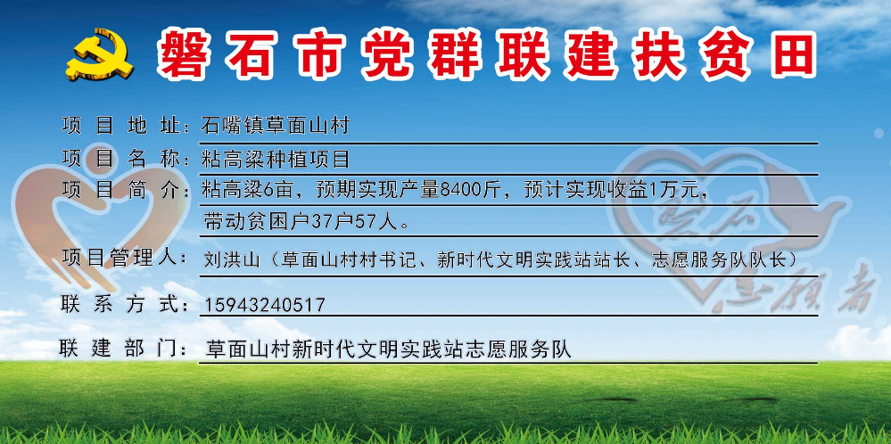 草面山村,全村行政区域14.6平方公里,下辖4个自然屯,现有322户,人口总数1120人,贫困户37户、57人,全村共有4支志愿服务队,志愿者213人,耕地面积354.6公顷,党群联建扶贫田1块、共5亩,主要经济作物是粘高粱,村书记:刘洪山,联系电话:15943240517。