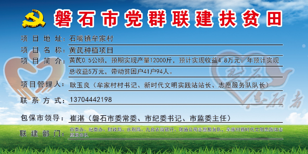 牟家村(省级贫困村),全村行政区域14.92平方公里,下辖4个自然屯,现有361户,人口总数1540人,贫困户41户、94人,全村共有1志愿服务队,志愿者236人,耕地面积3776亩,党群联建扶贫田1块、共5亩,主要经济作物黄芪,获得荣誉:五星级农村党建星级党组织,村书记:耿玉良,联系电话:13704442198。
