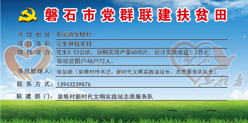 泉眼村,全村行政区域20平方公里,下辖6个自然屯,现有374户,人口总数1606人,贫困户48户、74人,全村共有4支志愿服务队,志愿者47人,耕地面积480公顷,党群联建扶贫田1块、共5.3亩,主要经济作物有花生。村书记:徐加新,联系电话:13943239876。