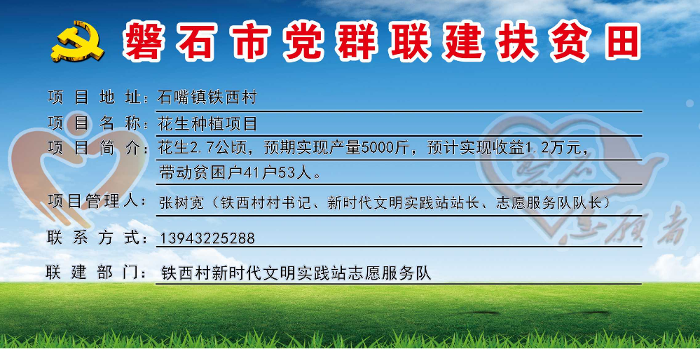 铁西村,全村行政区域25.52平方公里,下辖4个自然屯,现有280户,人口总数110人,贫困户41户、53人,全村共有5支志愿服务队,志愿者85人,耕地面积191.7亩,党群联建扶贫田1块、共5.4亩,主要经济作物有花生,村书记:张树宽,联系电话:13943225288。