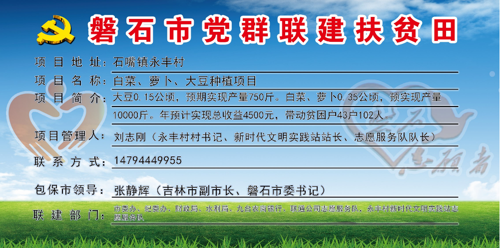 永丰村(省级贫困村),全村行政区域13.6平方公里,下辖4个自然屯,现有291户,人口总数1414人,贫困户43户、102人,全村共有4个志愿服务队,志愿者60人,耕地面积291公顷,党群联建扶贫田2块、共7.5亩,主要经济作物有黄豆、白菜、萝卜。获得荣誉:2015-2017磐石市三星级文明村。村书记:刘志刚,联系电话:14794449955。