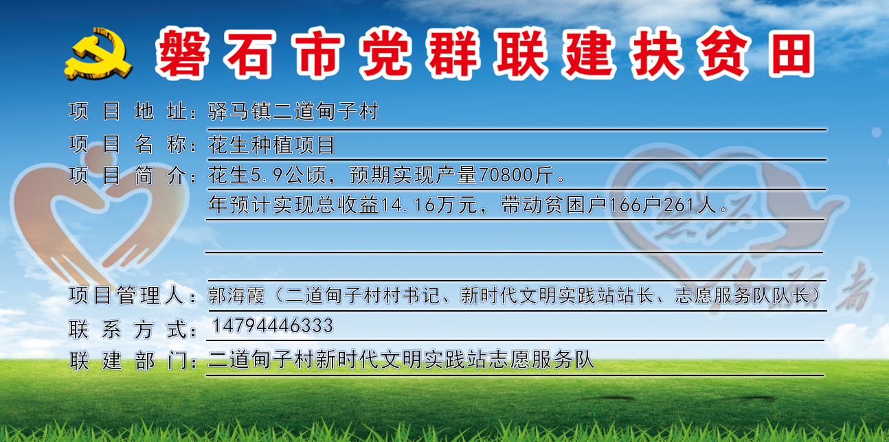 二道甸子村,全村行政区域27.3平方公里,下辖4个自然屯,现有441户,人口总数1504人,贫困户46户、77人,全村共有1支志愿服务队,志愿者8人,耕地面积430公顷,党群联建扶贫田3块、共59亩,主要经济作物有花生,村书记姓名郭海霞,联系电话:14794446333。