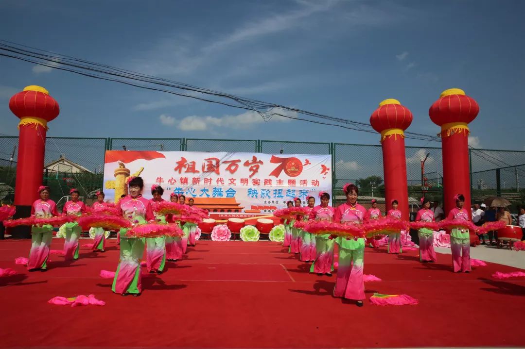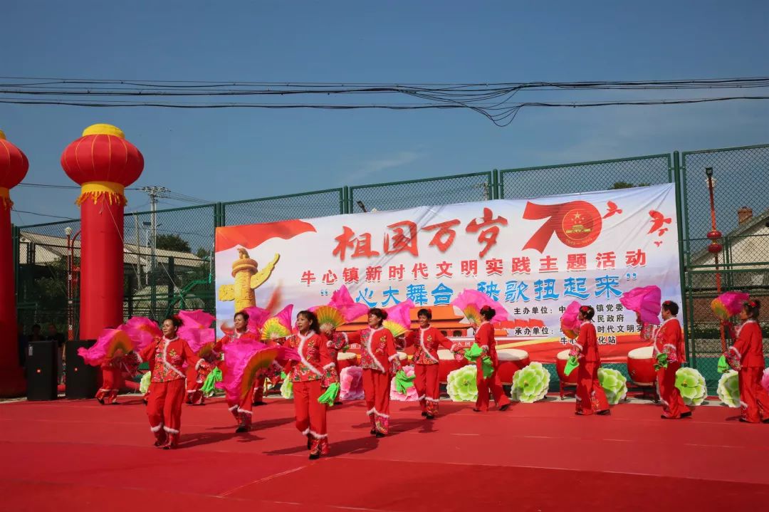 活动现场,在牛心镇健身广场举行庆祝中华人民共和国成立70周年秧歌汇演,9支新时代文明实践站秧歌队参加演出,演出人员169人,观众300余人。表演者们身穿艳丽服装,敲着锣鼓,扭着秧歌,气氛欢快而热烈。飞舞的彩扇、旋转的花伞、翻飞的红旗、优美的舞姿,现场群众都被欢乐的气氛所感染,纷纷参与其中舞动起来。