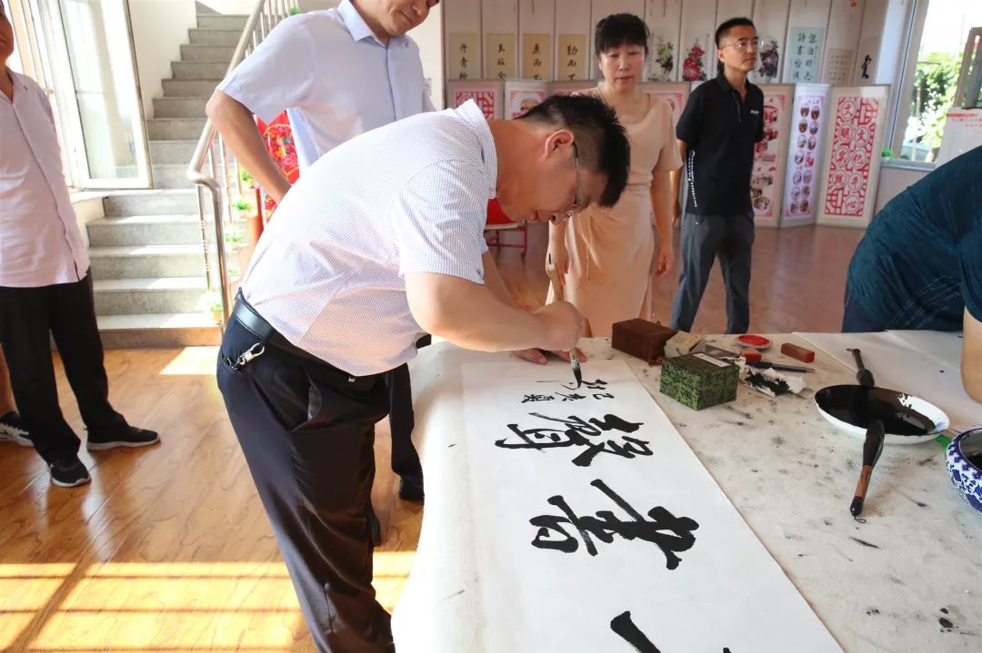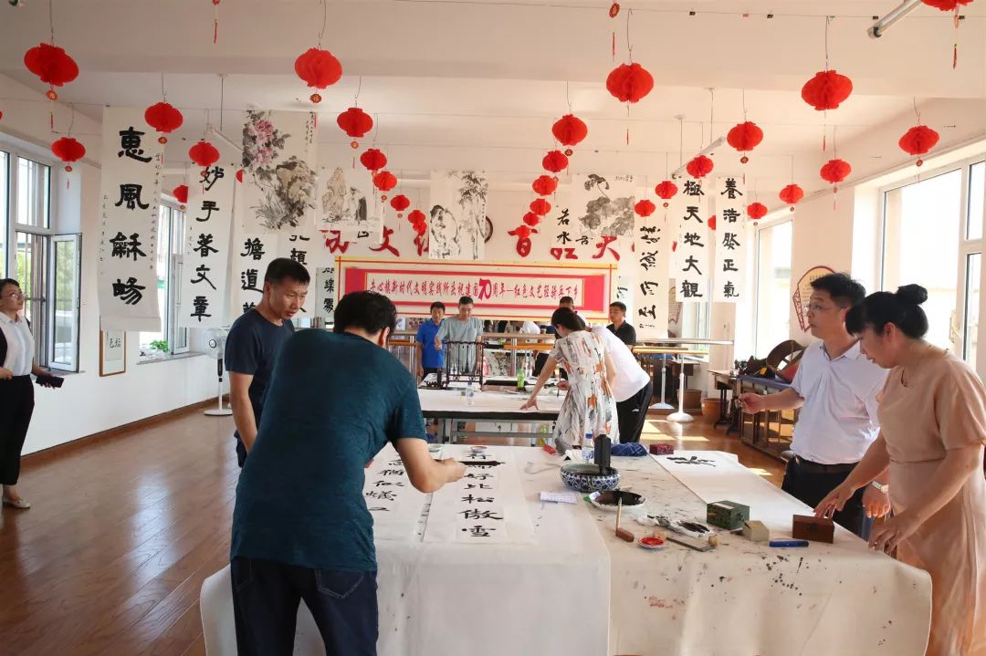 在牛心镇文化活动中心1楼大厅开展庆祝中华人民共和国成立70周年文艺轻骑兵下乡活动,市青年书画协会、镇域书画爱好者共20余人参加。笔会现场,丹墨飘香,爱好者们创作激情高涨,饱蘸着艺术热情在书案前挥毫泼墨,他们用手中的毛笔,创作一幅幅或雄浑厚重、或笔力遒劲、或挥洒奔放的书画作品,来表达对党和国家的热爱和对美好幸福生活的无限憧憬。
